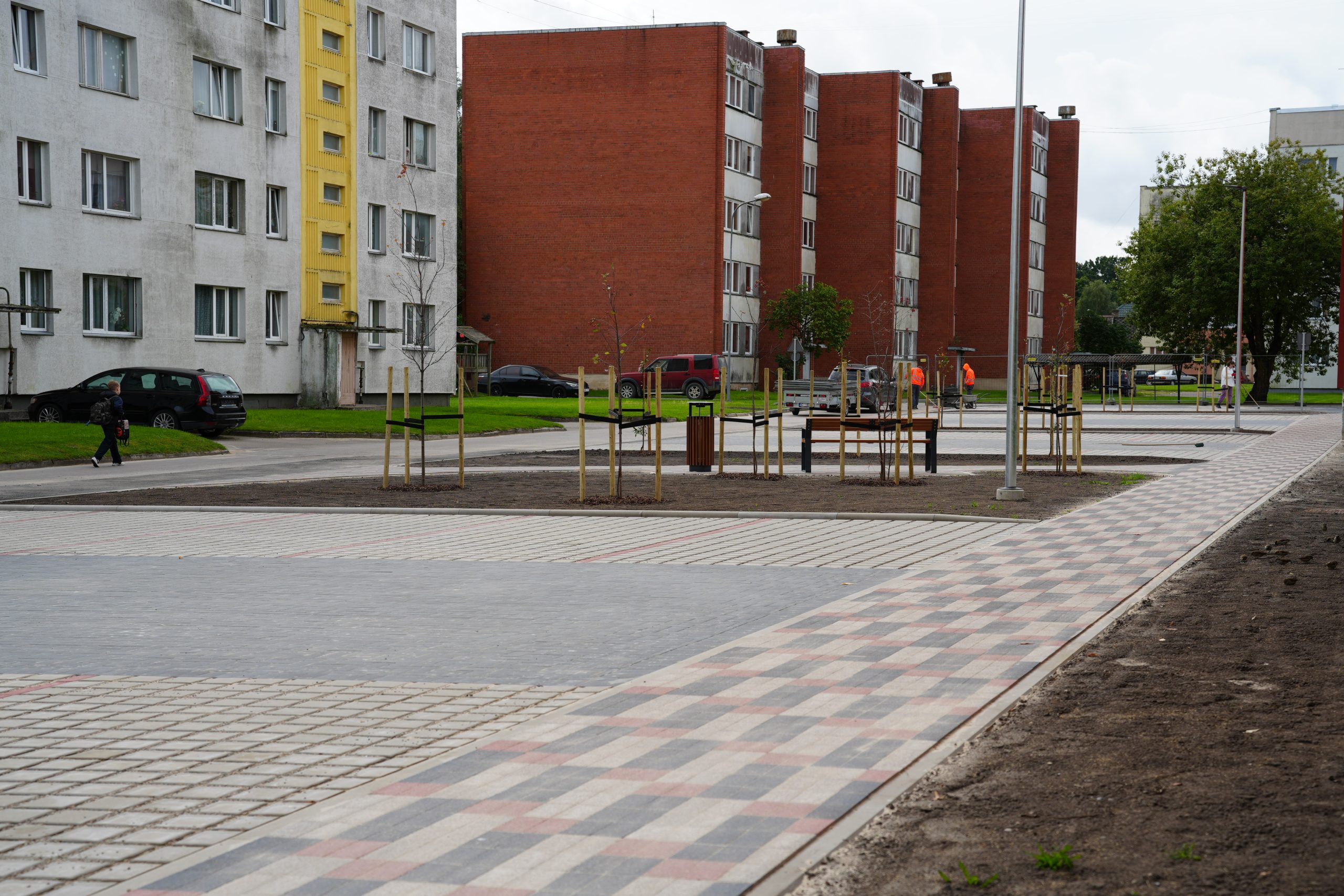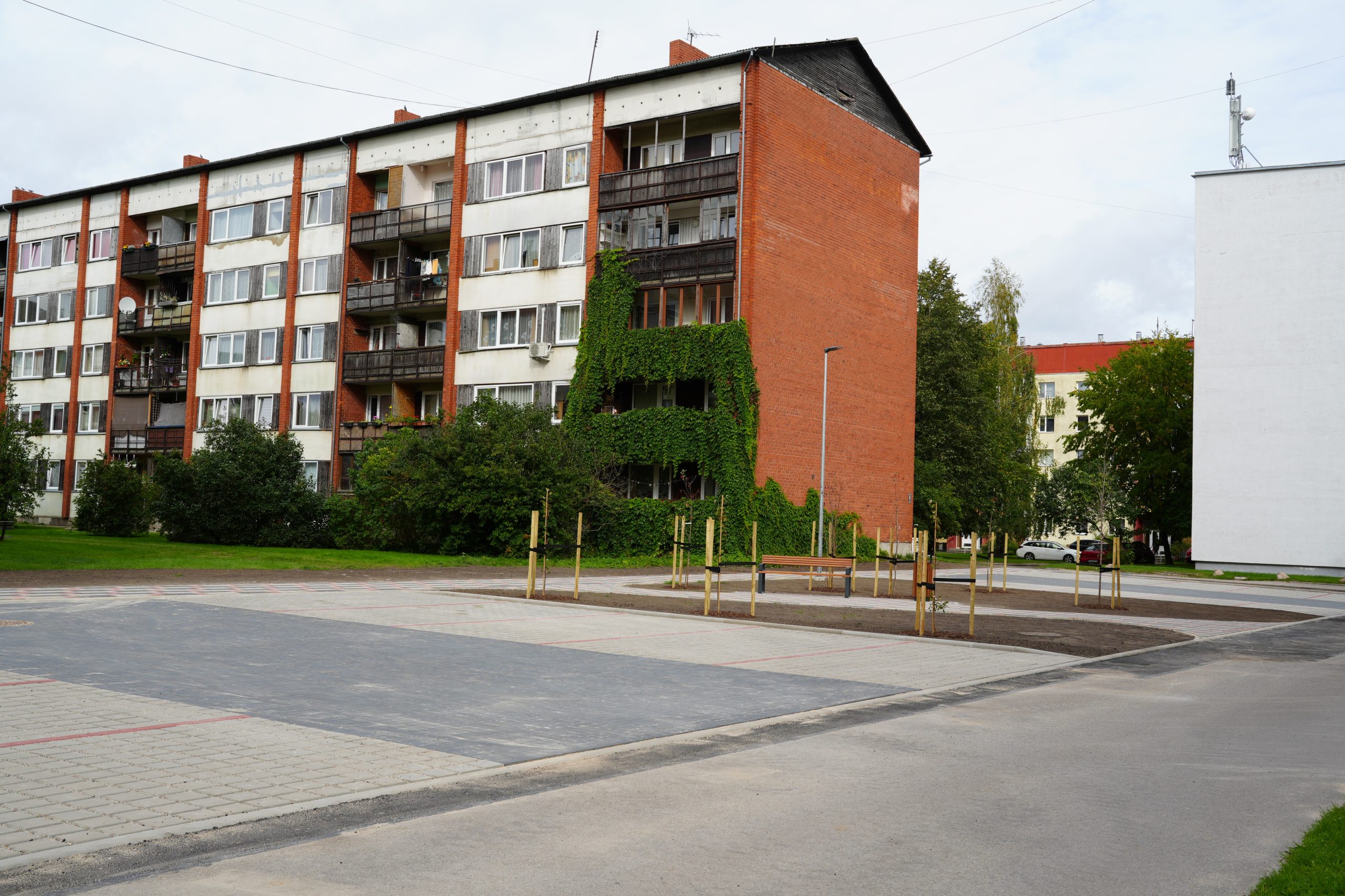 Stāvvietas un gājēju celiņi izbūvēti atbilstoši Vienotas Kuldīgas pilsētas daudzstāvu daudzdzīvokļu māju mikrorajonu pagalmu pilsētvides atjaunošanas, pārbūves un attīstības koncepcijai.