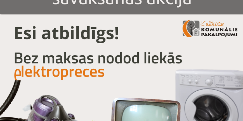 Septembrī Kuldīgas komunālie pakalpojumi atkal aicina iedzīvotājus nodot nevajadzīgas un savu laiku nokalpojušas elektropreces – ledusskapjus, veļasmašīnas, matu fēnus, radio aparātus, televizorus, datorus u.c.